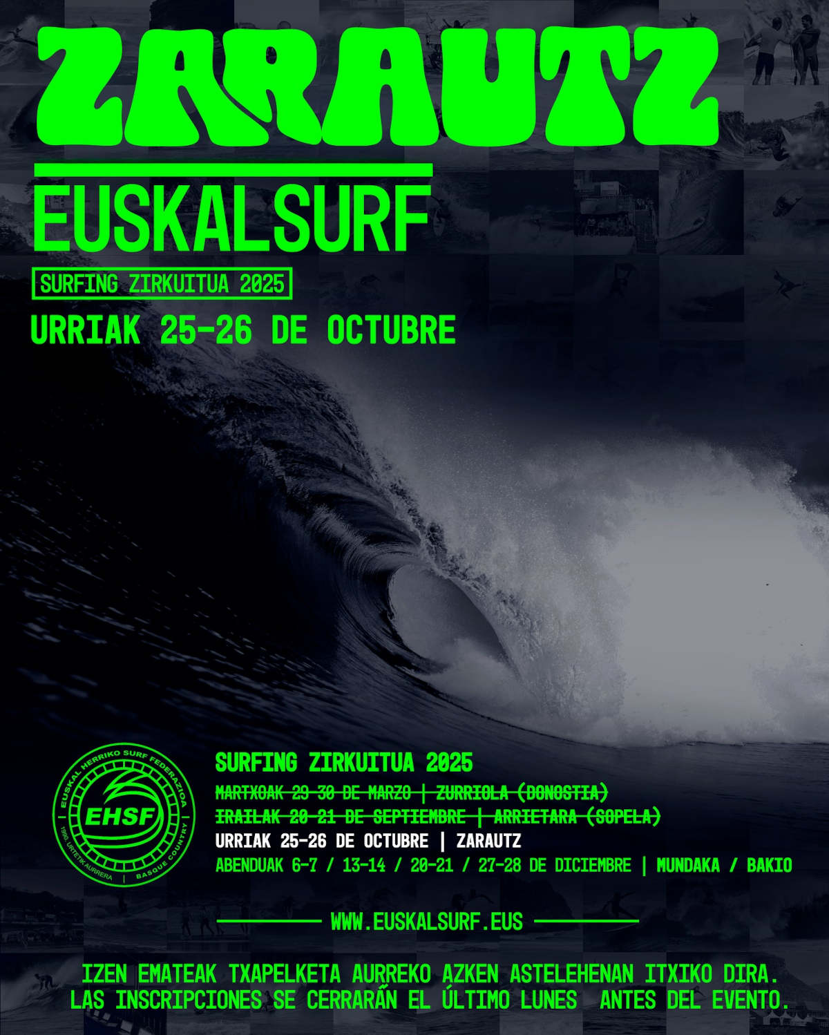 Los próximos días 25 y 26 de octubre se celebrará en la playa de Zarautz el campeonato de surf «ZARAUTZ EUSKALSURF» perteneciente al circuito 2025 organizado por la EHSF (Euskal Herriko Surf Federazioa)